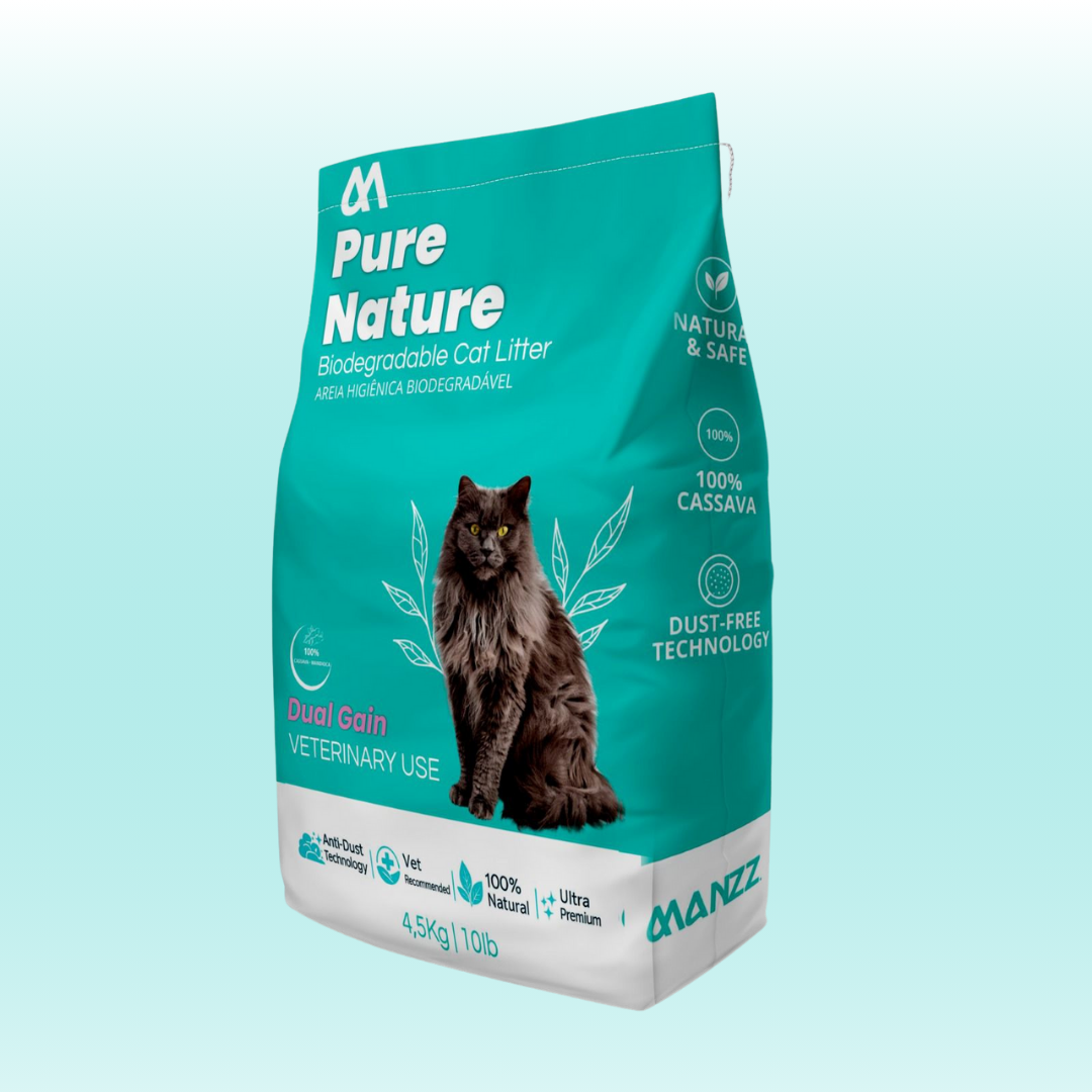 A Pure Nature MANZZ Dual Grain é uma areia higiênica premium de alto desempenho que combina grãos finos e médios para máxima absorção, controle superior de odores e menor espalhamento. Produzida com 100% mandioca natural, é ideal para lares exigentes.